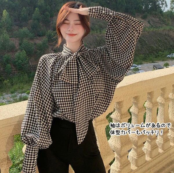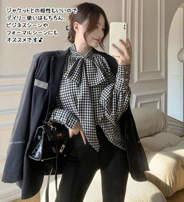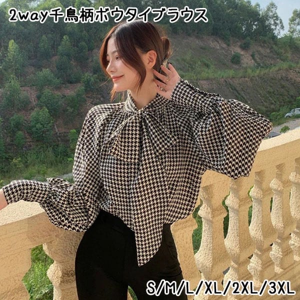 【送料無料 メ】レディース 2way千鳥柄ボウタイブラウス