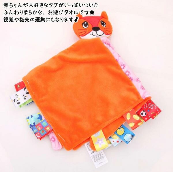 赤ちゃんが大好きな、タグがいっぱいついたお遊びタオルです♪