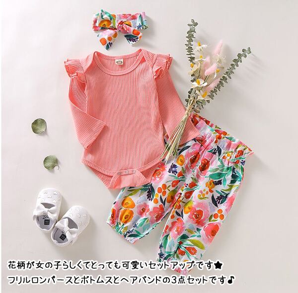 ベビー フラワーボトムス3点セット フリルロンパース 肩フリル 花柄 セットアップ ヘアバンド 女の子 可愛い かわいい 赤ちゃん 子供 子ども こども 韓国 出産 内祝い プレゼント誕生日 春 秋 50 60 70 80 90 rsset-b11