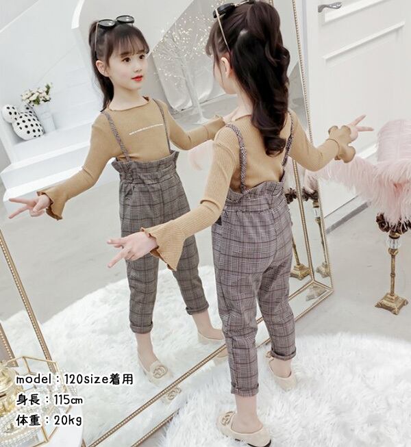 【送料無料 宅ゆ】女の子 グレンチェックサロペット&トップスセット セットアップ ロゴT ロンT 長袖 パフスリーブ 可愛い 子供服 子ども服 キッズ 韓国 プレゼント お揃い 双子 姉妹 春 秋 110 120 130 140 150 160 rsset-k16 190905
