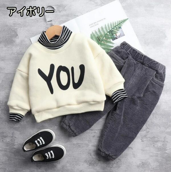 キッズ YOU&ME 極暖!裏起毛ハイネックトレーナーセットアップ 上下セット スウェット レイヤード風 男の子 子供服 子ども服 こども服 コーデュロイパンツ ロゴ シンプル 女の子 韓国 出産 お祝い プレゼント ギフト 秋 冬 80 90 100 110 120 rsset-k19 191206