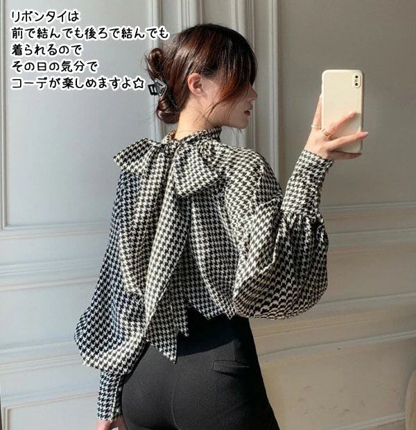 【送料無料 宅メ】レディース 2way千鳥柄ボウタイブラウス 襟リボン ボウタイ りぼん 長袖 シンプル オシャレ お洒落 可愛い 上品 フェミニン エレガント とろみシャツ 春 秋 OL 会社 披露宴 パーティー 卒園式 卒業式 入園式 入学式 RSTP-L23 230214